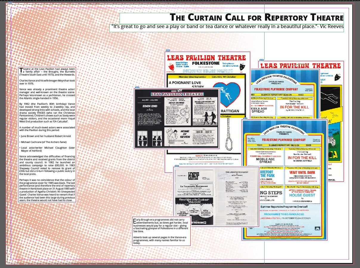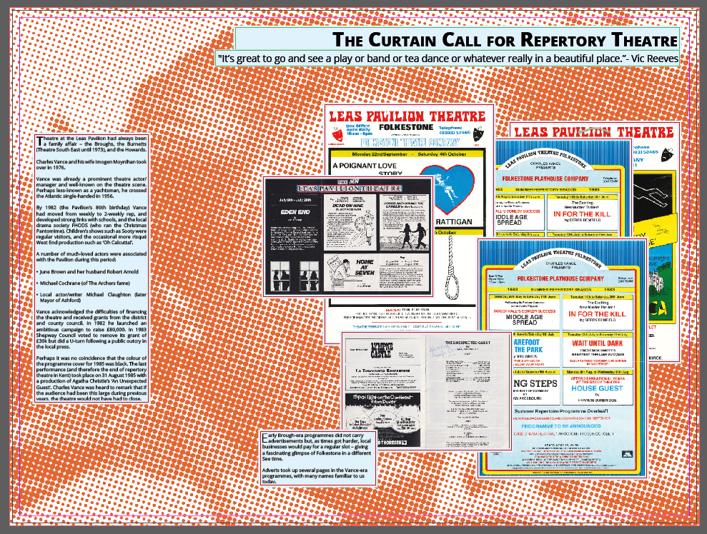 After working on the branding and design for the Leas Pavilion Archive, I was asked to curate and design an opening exhibition. This exhibition would be open for a week in the centre of Folkestone, and would be used to launch the Leas Pavilion Archive, gain further public interest and support in the project, and hopefully secure additional funding the the Leas Pavilion Archive and subsequent Friends of the Leas Pavilion projects.