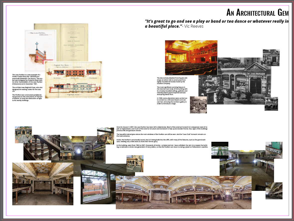 After the flyer was designed, the longer process of creating the artboards for the exhibition could begin. Originally, the brief and conversations with the Friends of the Leas Pavilion had asked for the design of eight artboards. But, development conversations and a feedback meeting during the process expanded this to ten boards, to properly accommodate the history of and vision for the building.